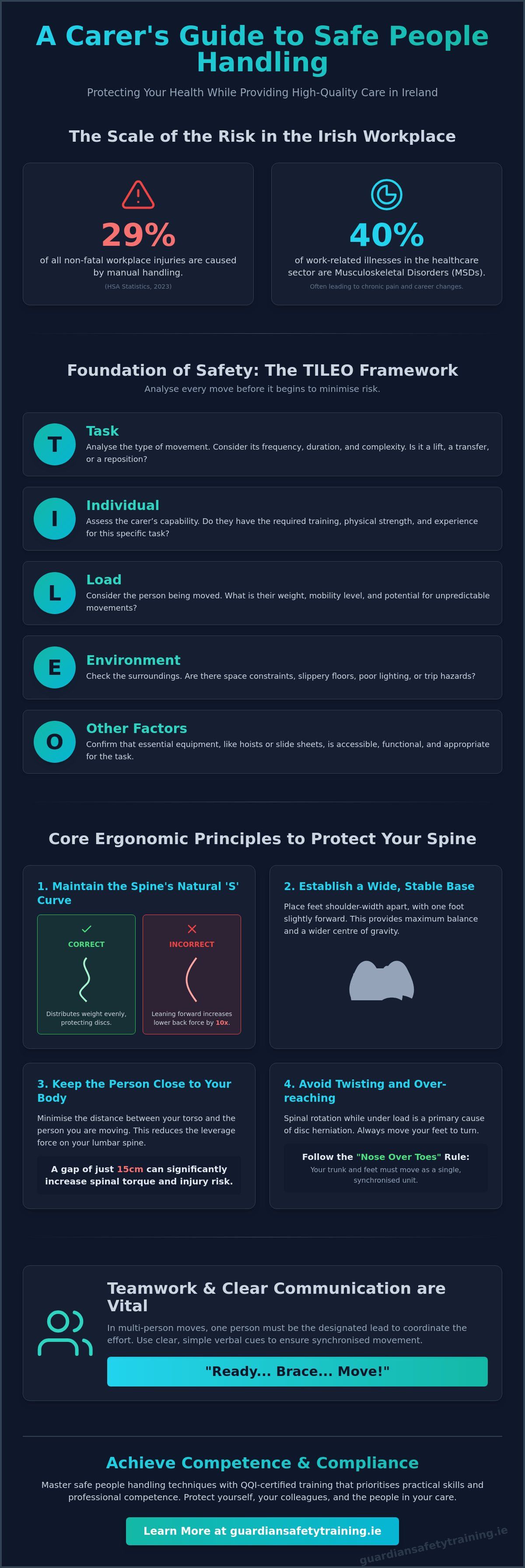 TILEO is a risk assessment tool used to remember the key factors to consider before any handling task: Task, Individual (the carer), Load (the person), Environment, and Other factors (like equipment).